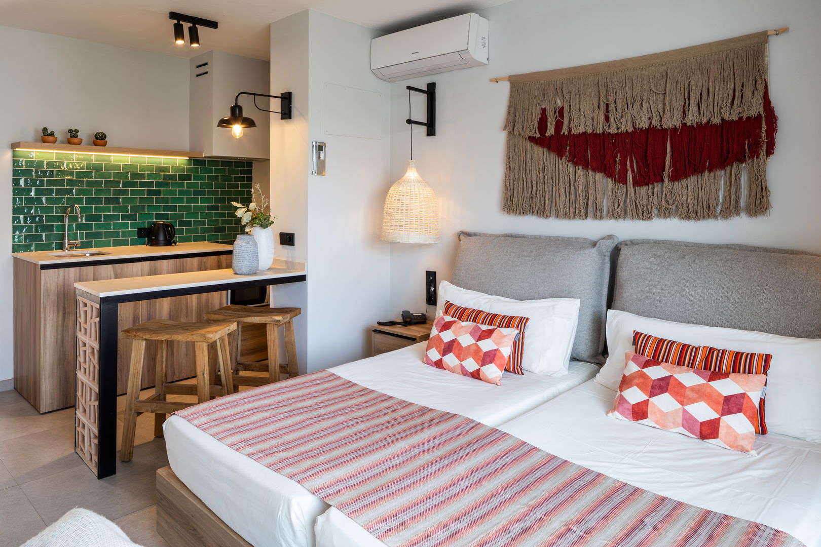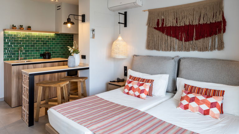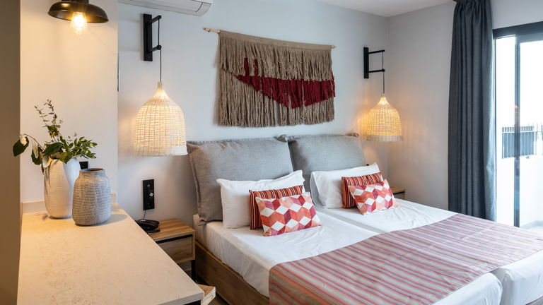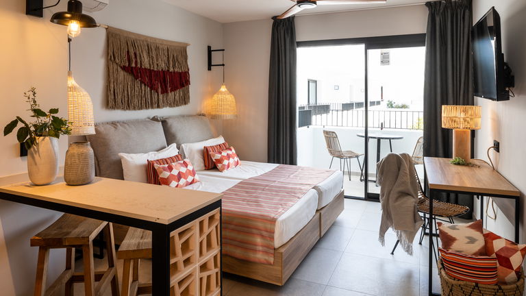 Bienvenido a tu Junior Suite de 27m2, donde el espacio se multiplica y el confort se maximiza. Diseñada para compartir momentos especiales, esta suite combina un ambiente acogedor con todas las comodidades que necesitas. Tu balcón privado será el escenario perfecto para vivir la magia de Ibiza. Reserva tu suite en Sant Antoni, Ibiza.